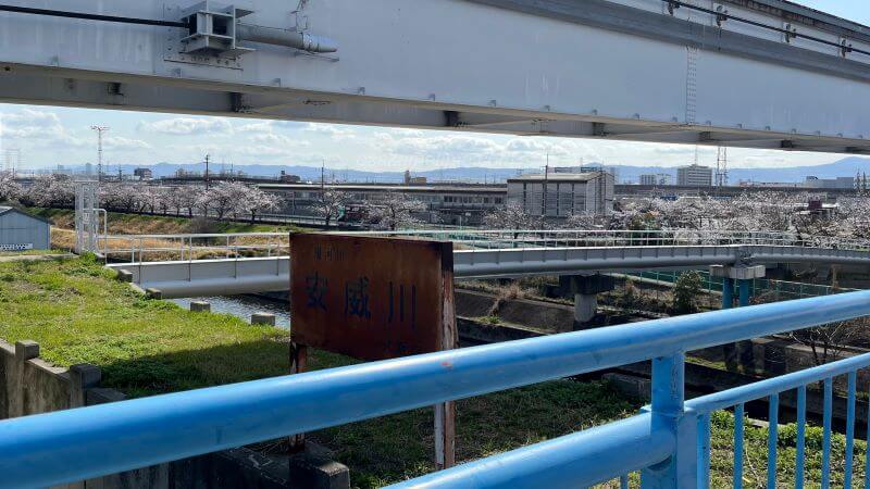 桜並木は、JR貨物ターミナル(右側)と安威川(左側)の間の堤防上にあり、